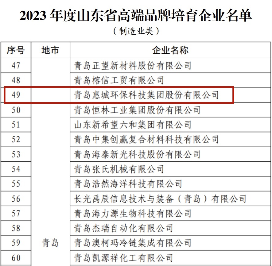 日前,山東省市場監(jiān)督管理局公布了“2023年度山東省高端品牌培育企業(yè)”名單,青島惠城環(huán)保科技集團(tuán)股份有限公司榜上有名。