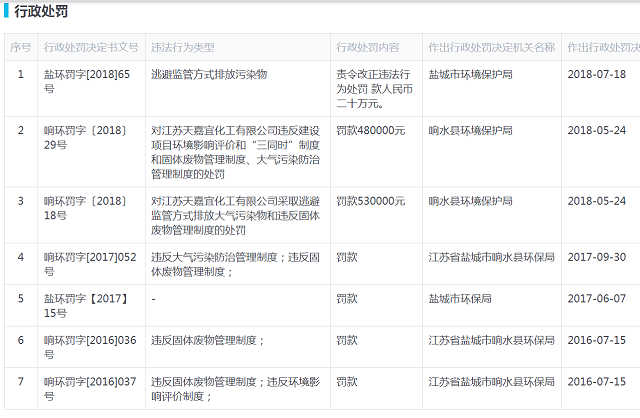 鹽城市環(huán)境保護(hù)局2017年7月行政處罰公示顯示,江蘇天嘉宜化工有限公司存在項(xiàng)目配套的環(huán)保設(shè)施未驗(yàn)收、危廢管理不規(guī)范等違法行為,處罰款28萬元。