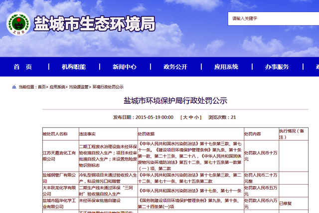 鹽城市環(huán)境保護(hù)局2015年5月19日公布的行政處罰公示顯示,江蘇天嘉宜化工有限公司二期工程廢水治理設(shè)施未經(jīng)環(huán)保驗(yàn)收擅自投入生產(chǎn);未設(shè)置危險廢物識別標(biāo)志,處罰款人民幣10萬元。